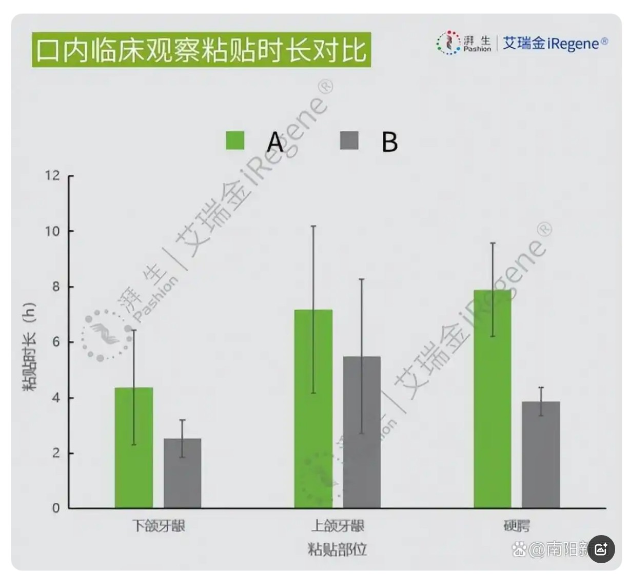 “艾瑞金iRegene水胶体贴/IntraOral Wound Dressing”,在模拟湿润口内环境粘附时长,可达48h以上,是对照品的2倍以上!在牙模湿润环境可达到72h以上!在口内临床实际应用中,粘附力更持久,可达6~10h,耐用性更强,同样显著优于对照品,是对照品的2倍左右!