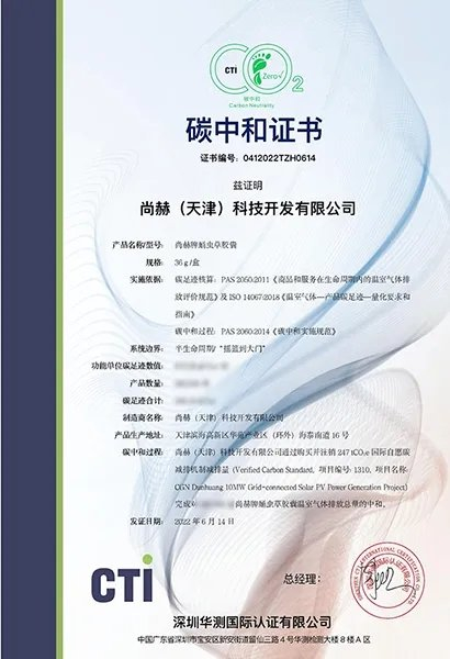 尚赫公司蛹虫草胶囊所获碳中和证书